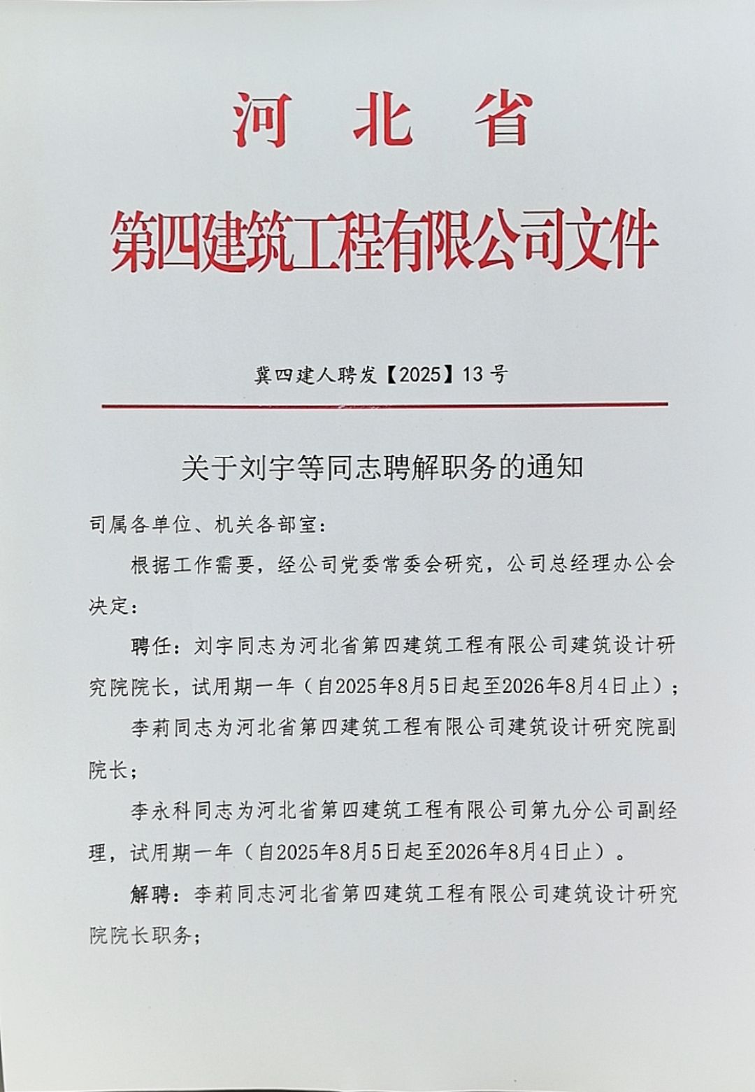 河北四建:关于杨帅等同志聘解职务的通知